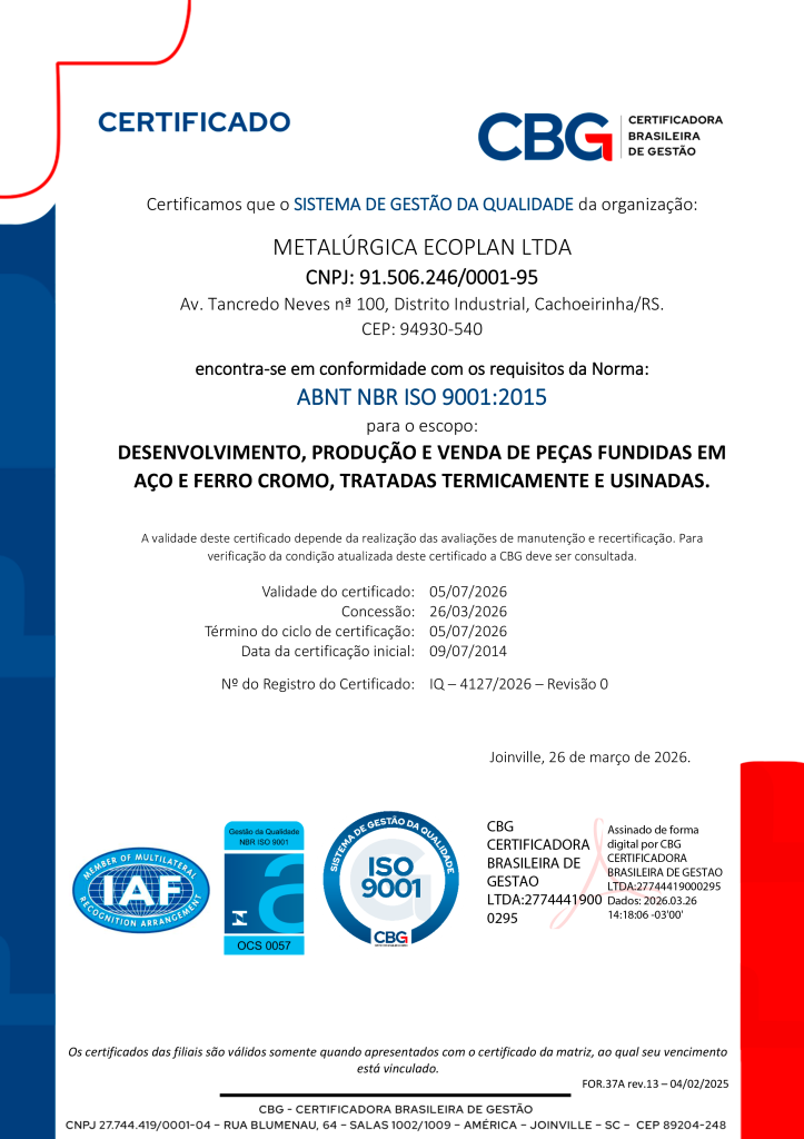 A Qualidade Ecoplan é assegurada desde o recebimento das matérias-primas até o produto acabado, através da realização de rigorosos ensaios, controles de processos e inspeção final. O constante aperfeiçoamento de processos e o investimento em qualidade e desenvolvimento, permite à Ecoplan oferecer aos seus clientes o que há de melhor em tecnologia de fundição e usinagem de aço.